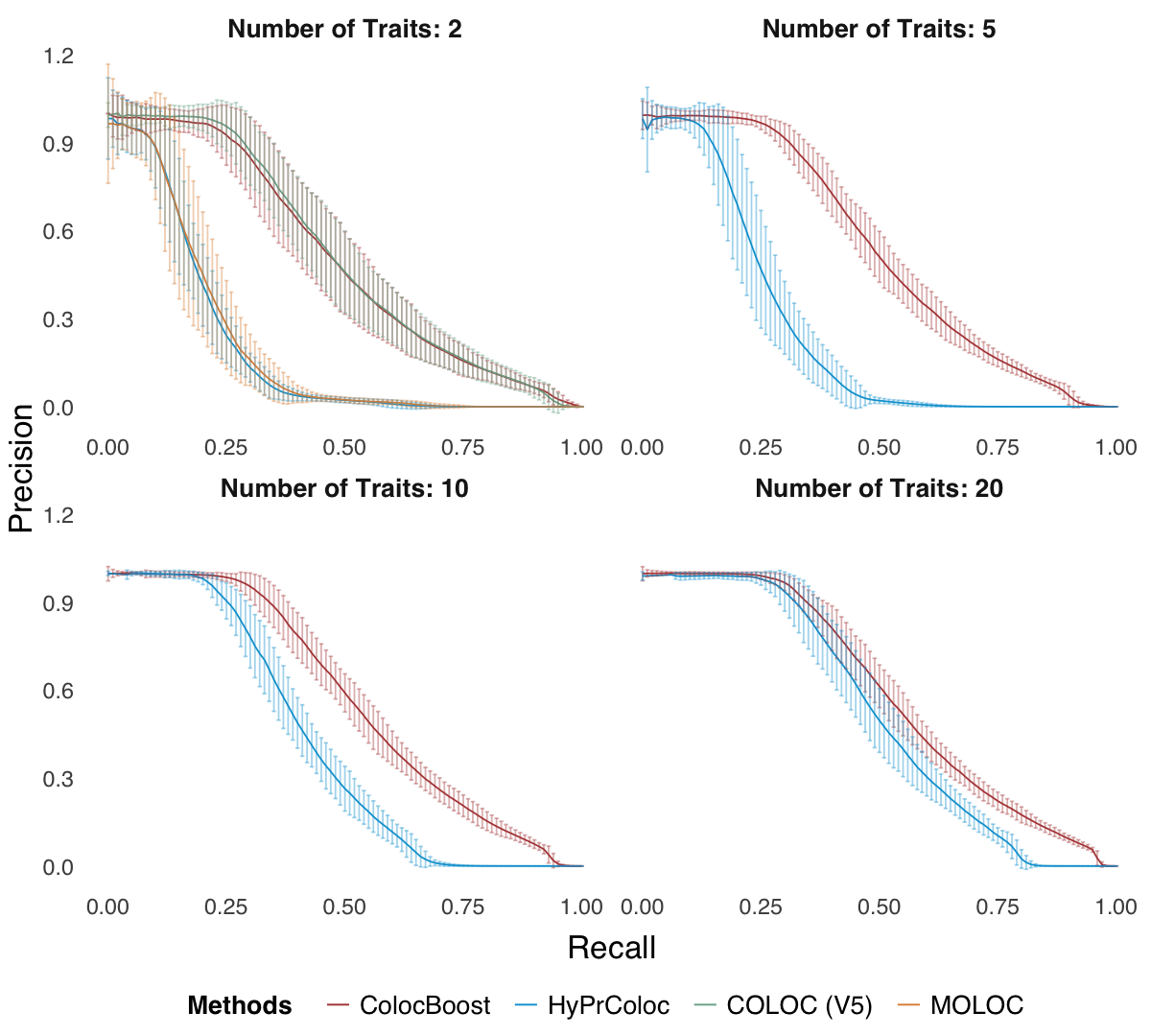 Variant‐level precision‐recall curves by varying the colocalization score threshold (ColocBoost uses VCP; COLOC/HyPrColoc use variant-level scores from their respective methods; Methods and Supplementary Note).