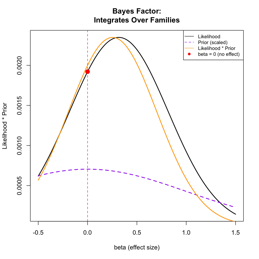 c("Likelihood", "Prior (scaled)", "Likelihood * Prior", "beta = 0 (no effect)"),