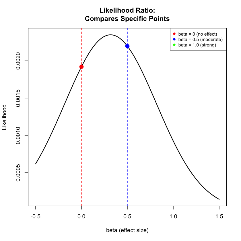 main = "Likelihood Ratio:\nCompares Specific Points")