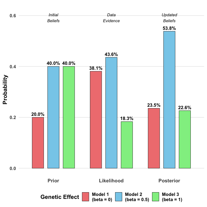For example, from previous studies we might believe large genetic effects (\(\beta = 1.0\)) are rare, while small or no effects are more common. How do we combine prior knowledge with observed data to get updated beliefs?