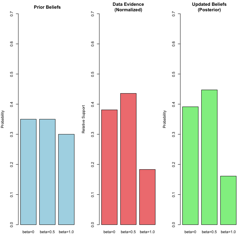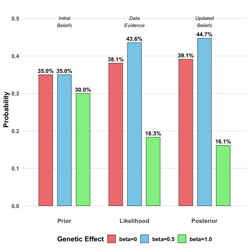 In our previous likelihood analysis, we found that among our three theories about genetic effects (\(\beta = 0\), \(\beta = 0.5\), \(\beta = 1.0\)), the data supported \(\beta = 0.5\) most strongly. But this raises a new question: What if we had some prior beliefs about which theory was more plausible before seeing the data?
