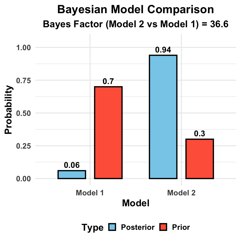 subtitle = paste("Bayes Factor (Model 2 vs Model 1) =", round(bayes_factor, 2)),