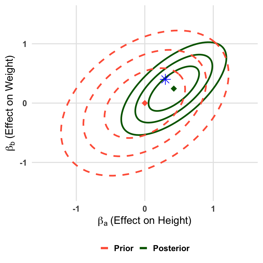 Let’s visualize how observing data updates our joint beliefs about both effects. We’ll show the prior and posterior distributions as contour ellipses in the two-dimensional parameter space.