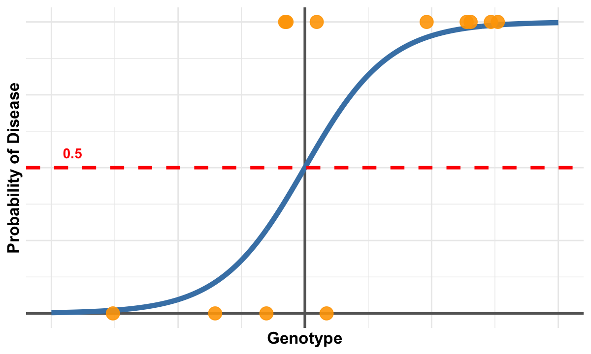 The orange points represent observed data where individuals either have disease (\(Y=1\)) or not (\(Y=0\)), while their x-position shows their genotype value. The red dashed line at probability 0.5 serves as a decision threshold.