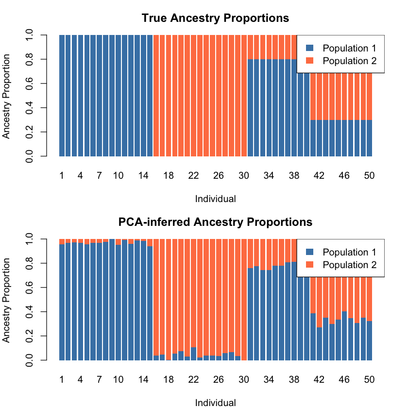 While PCA can visualize population structure, for admixture analysis it is better to use the ADMIXTURE model introduced in Factor Analysis. Here’s why: