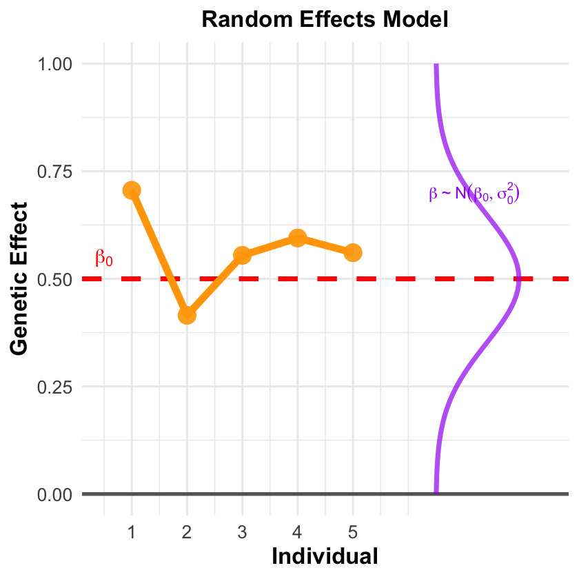 Instead of assuming one fixed effect for everyone, we’ll draw each person’s genetic effect from a distribution. This captures the reality that the same variant might have slightly different impacts across individuals due to all the factors we can’t measure or don’t even know about.